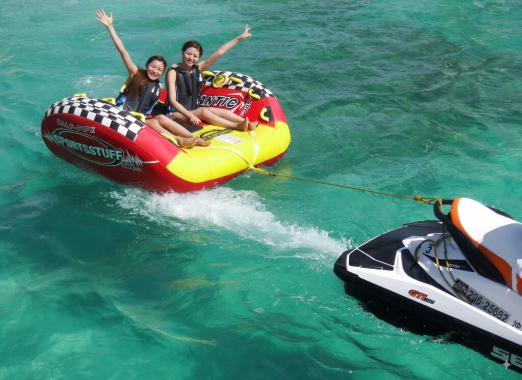 ② 沖縄の海を満喫プラン(人気) | 約2時間 | バナナボート+マーブル+トーイングチューブ+シュノーケル | 大人 11,000円/小人 9,900円 |